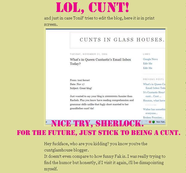 Haha! Like Queen Cuntastic would ever edit her blog in response to a twatfungus peon like Rachel Crane.