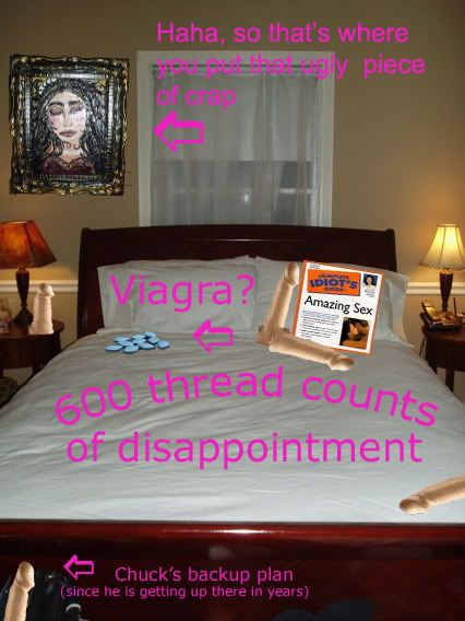 Rachel, the Queen came across this picture of your bedroom in her travels on the internet. Honestly, we weren't all that impressed. Perhaps you should add 'start watching more HGTV' to your repertoire to help occupy you in your many hours of spare time - that is, when you're not cunting around on The Nest or cultivating your little pot plants.